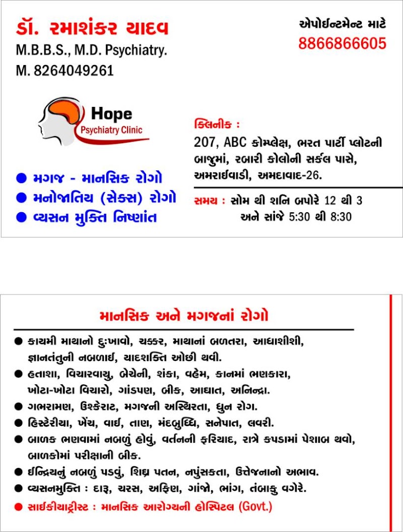 He is a well trained and next level of psychiatric in Ahmedabad. He has good diagnosis and understanding of symptoms hence, avoiding overdose of medicine. I strongly recommend to anyone has to be visit Hope clinic if having any symptoms of psychopath illness. It is curable if get prober diagnosis and treatment. So, Dr. Rama Shankar Yadav is best example. It's worth of treatment.