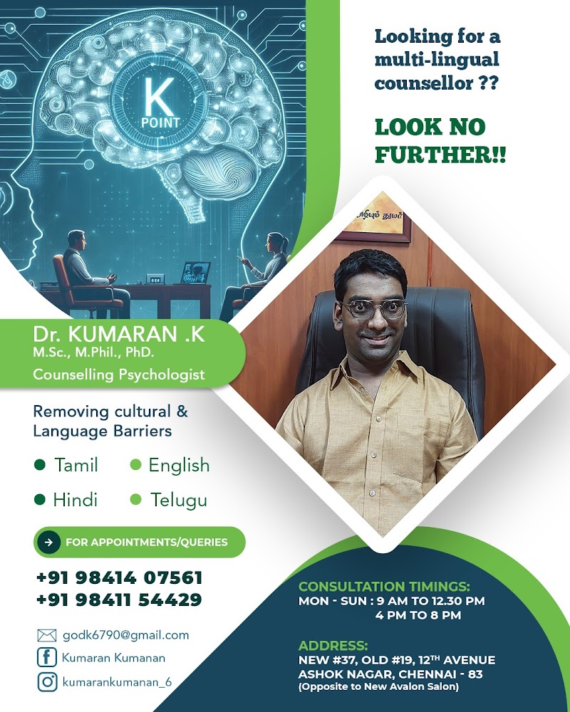 I had a consultation with Mr. Kumaran at K Point for sudden anger spikes, and it was a very positive experience. He explained things clearly and practically, helping me to understand how to approach situations calmly and improve my behavior. His friendly and reassuring nature instantly builds confidence and makes it easy to open up. I truly appreciate the clarity, guidance, and support he provided. Highly recommended.