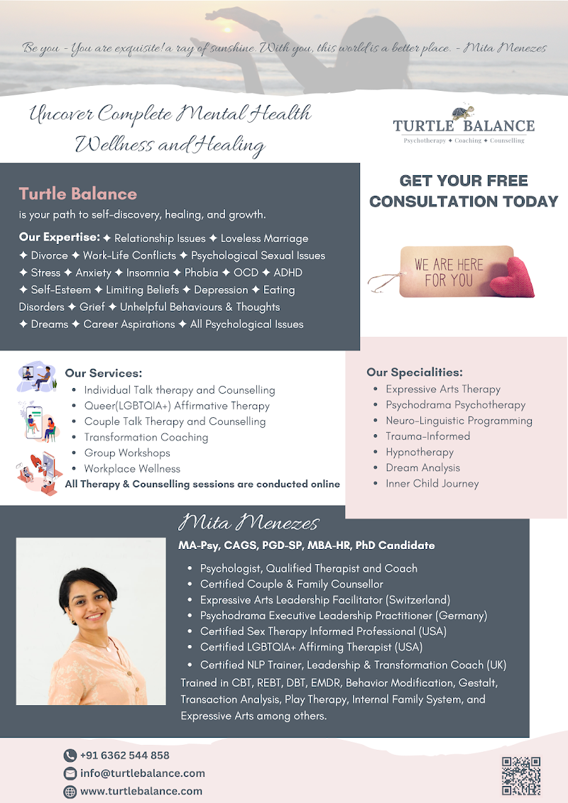 I had reached out to Turtle balance for individual therapy sessions during a time when I felt everything going haywire, especially how I felt mentally. Sessions with Mita were like none other since I’ve been to other therapists before. The others would always give generic strategies which I knew too but couldn’t implement in a real life setting. But sessions with Mita felt like I was delving into my own mind, understanding the different parts of me that influence what I feel and how I react. She always brought in new modalities and new techniques into the session like parts work, role play, psycho drama and many more! Mita’s sessions and her passion for the human mind is not only seen by the extensive list of certifications that she has, but also by how she can touch a human mind so deeply! I thank Mita for what she has done for me, and how she has enabled me to reflect and implement this in everyday life! I would highly recommend her to anyone who is struggling mentally!