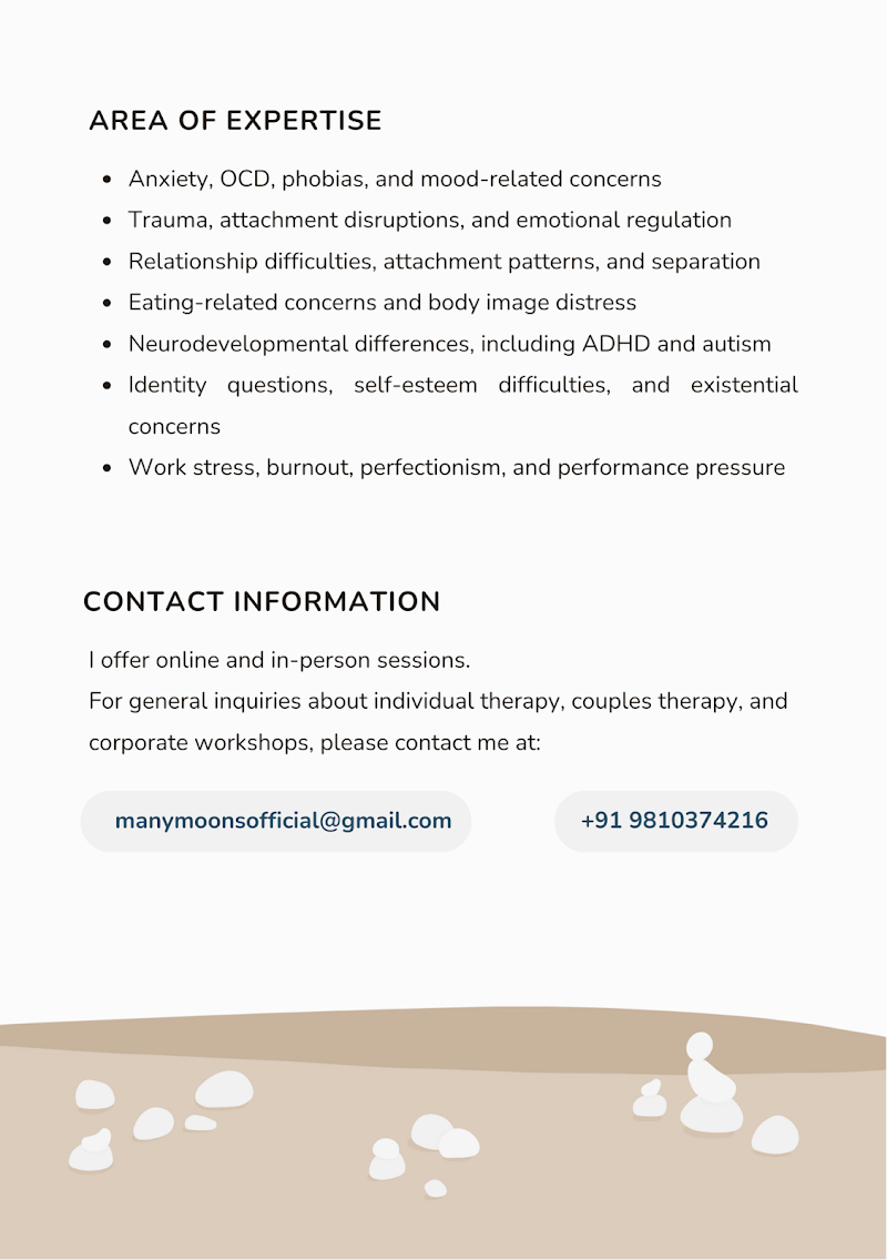 Swati is thoughtful and patient, and takes the time to understand your concerns. When offering suggestions, she remains flexible rather than rigid, and you feel reassured rather than flawed. Her subject knowledge is strong, and she brings a wide range of perspectives that helped me better understand my own blind spots, patterns, and behaviours. What helped me manage stress was learning mindfulness and understanding that my anxiety was not always pathological. This changed how I dealt with day-to-day stressors. I would recommend her especially to those looking for depth, clarity, and long-term change.
