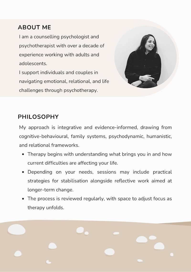She's an excellent psychologist and, more importantly, someone who genuinely cares about the people she works with. She listens without judgment, asks the right questions, and makes you feel comfortable from the very first conversation. What really stands out is how practical and grounded her approach is - no unnecessary jargon, just honest conversations and clear guidance. She's professional, warm, and truly invested in helping people feel better and grow. I'd confidently recommend her to anyone looking for real support from someone who knows what they're doing.